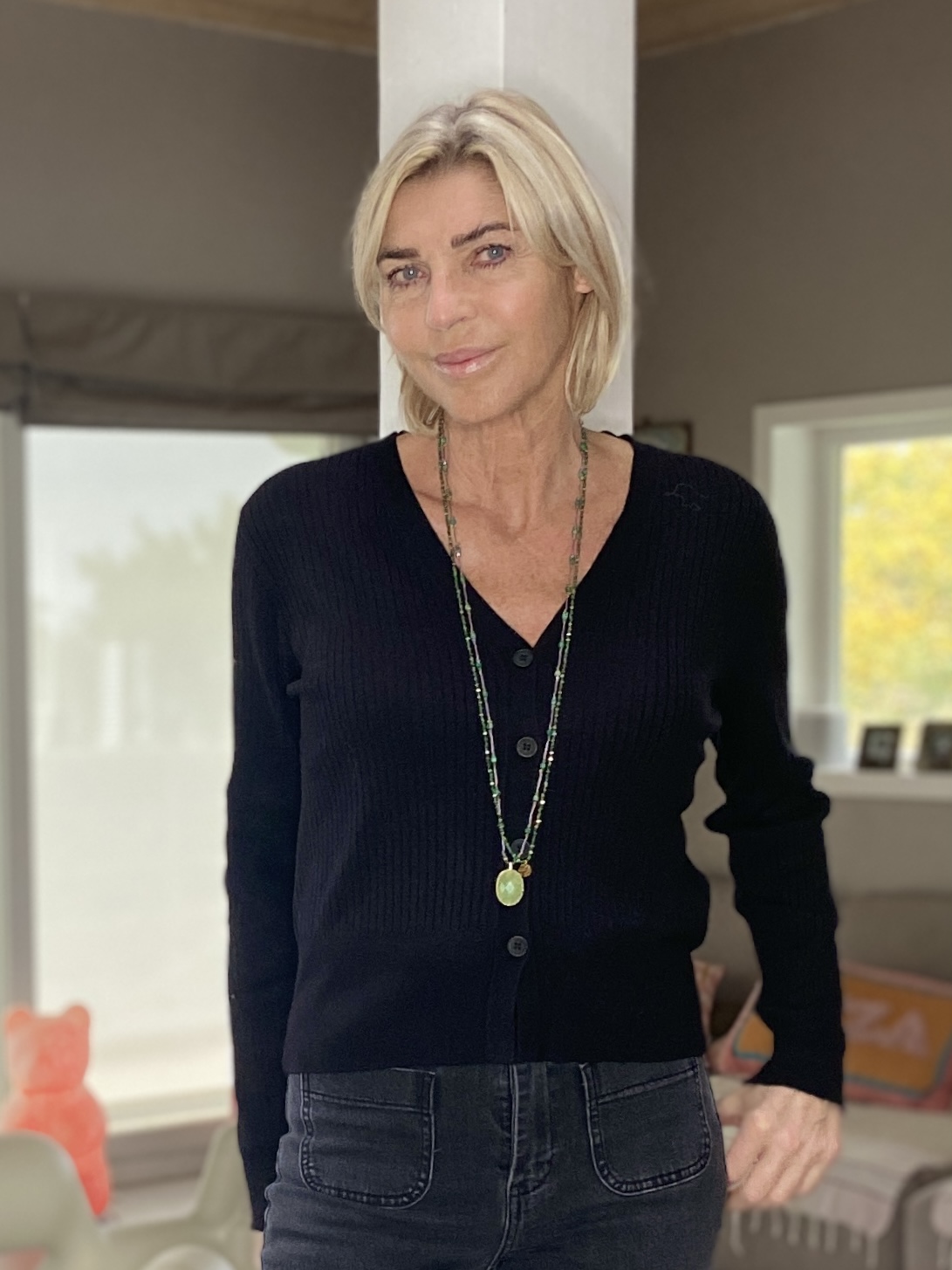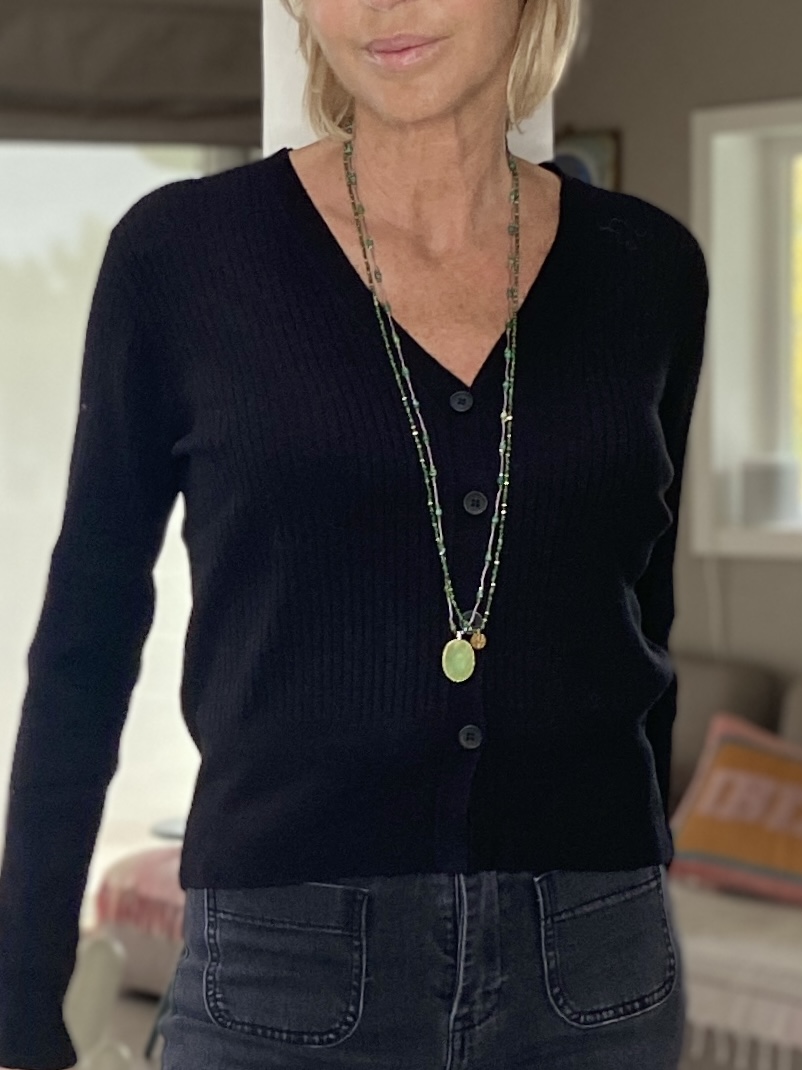 Près du corps et col V. Tout doux et chaud. A porter en pull ou en gilet.